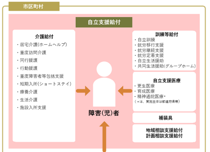 市区町村の障害福祉担当窓口や支援事業者に相談します。サービスの利用を希望する場合は、市区町村の障害福祉担当窓口に申請します。