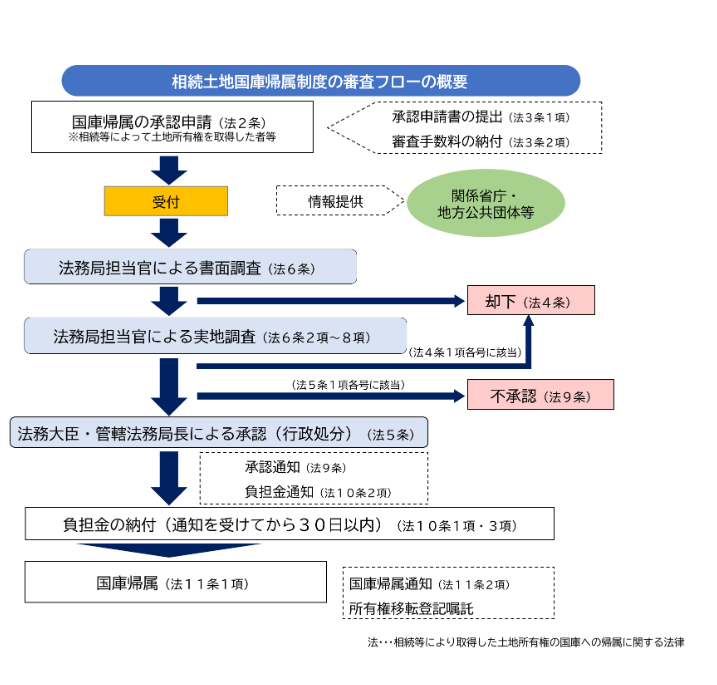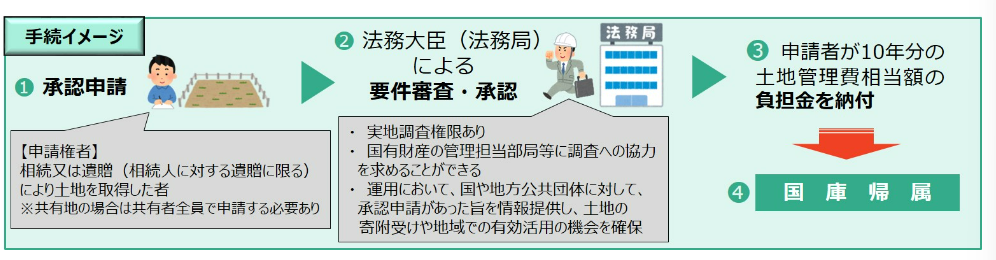 ①相続等によって、土地の所有権又は共有持ち分を取得した者は、法務大臣に対して、その土地の所有権を国庫に帰属させることについて、承認を申請することができます。