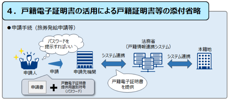 例えば、パスポートの発給申請において、申請書と併せて戸籍電子証明書提供用識別符号(有効期限3か月のパスワード)を申請先の行政機関に提示することにより、申請先の行政機関が戸籍電子証明書(電子的に戸籍情報を証明したもの)を確認することができるようになり、戸籍証明書等の添付が不要となり、オンラインで手続きが完結できるようになります。