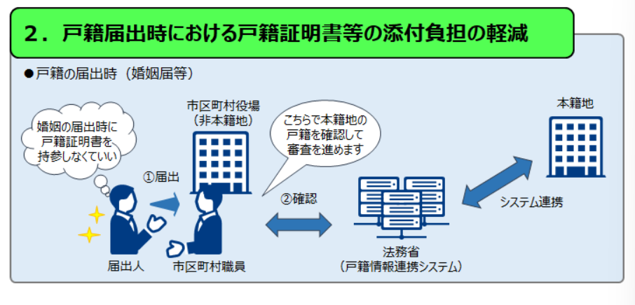 例えば、新婚旅行先の市区町村の窓口に婚姻届けを提出する場合、本籍地ではない市区町村の窓口に戸籍の届出を行う場合でも、提出先の市区町村の職員が本籍地の戸籍を確認することができ、戸籍届出時の戸籍証明書等の添付が原則不要になりました。