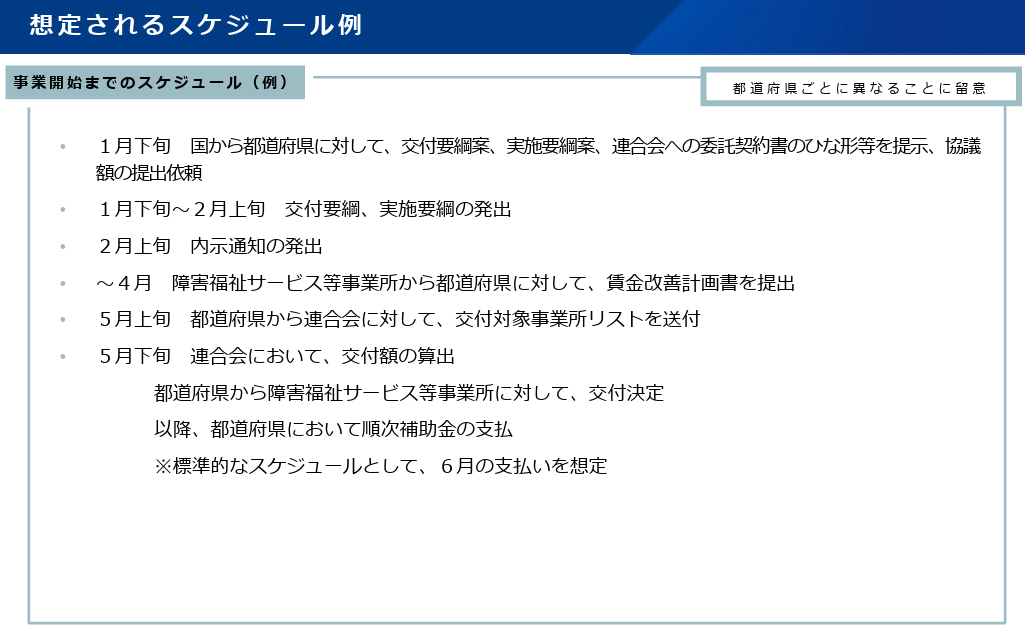 補助金の支払われる時期は下記の通りになります。標準的なスケジュールとして、6月の支払いとなっていますが、都道府県によって支払われる時期が違うことも予想さますので、注意が必要です。
